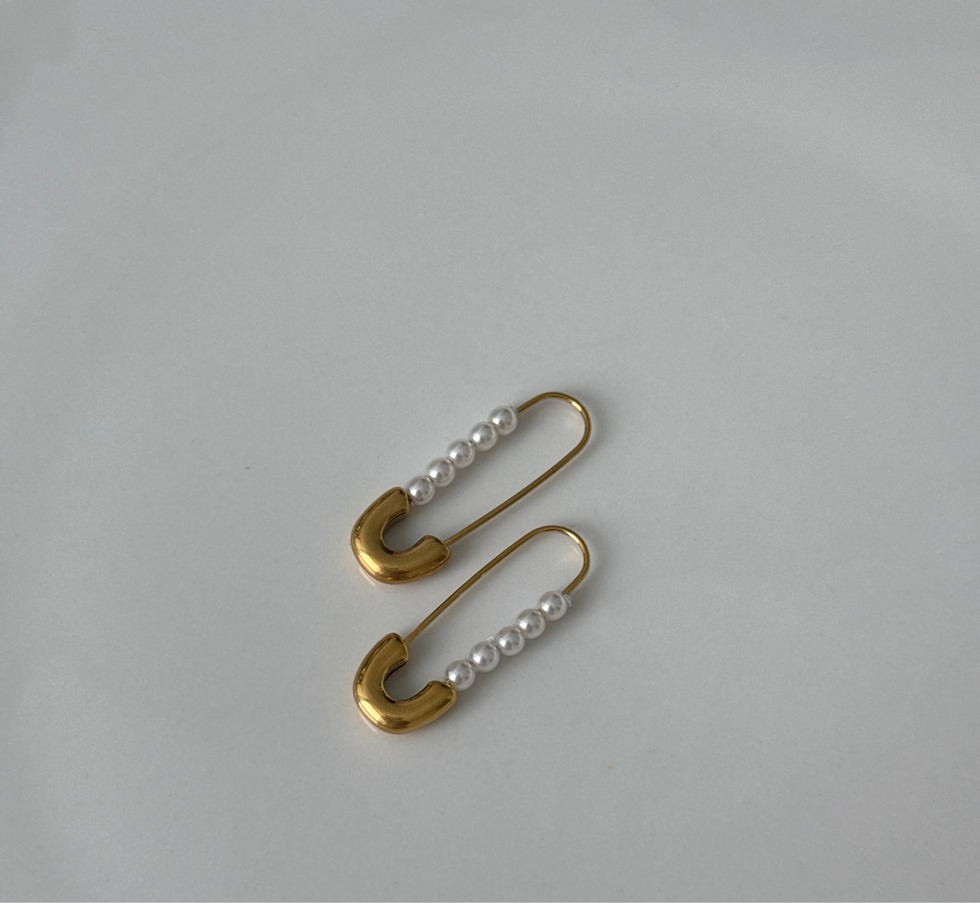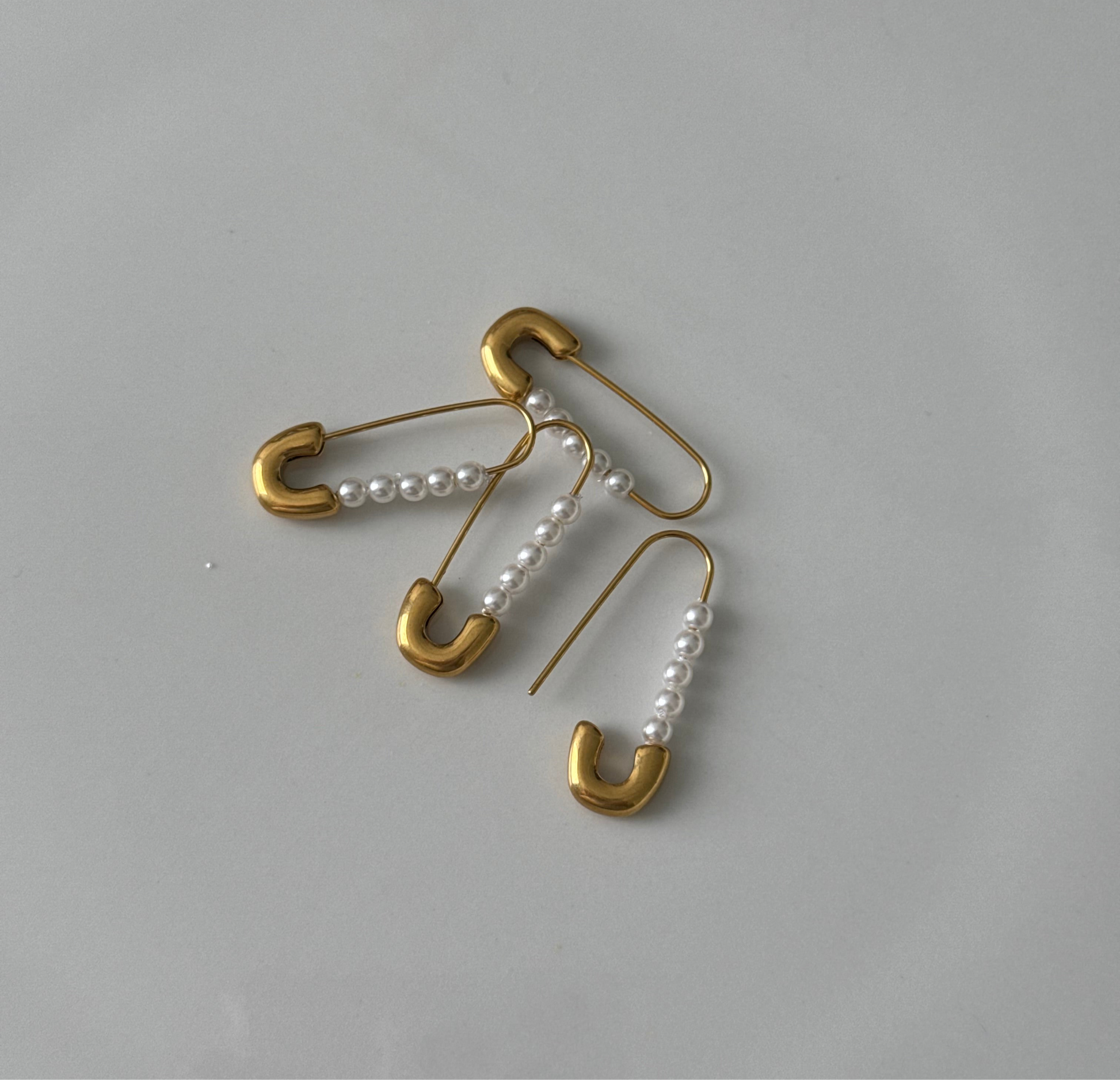 Elegant gold-tone earrings with pearls, inspired by the subtlety and style of safety pins. With a minimalist yet sophisticated design, these earrings add a delicate touch of glamour to any look.